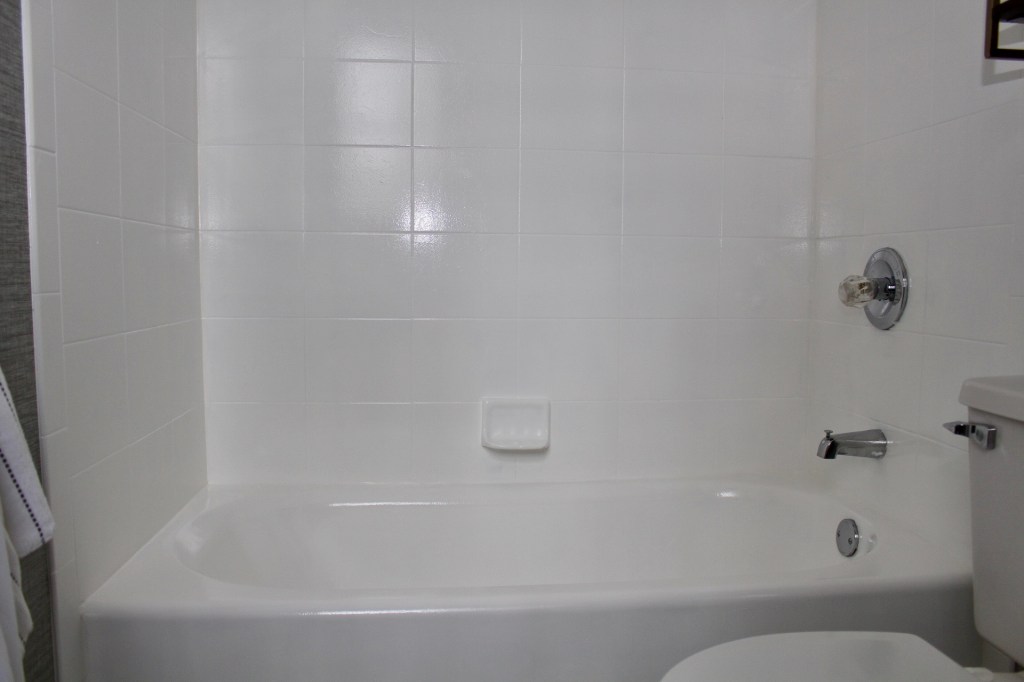 The actual painting part is super easy. If you can paint a wall, you can do this. I was planning on painting the shower tile and the floor tile. But once I did the that, the tub-that-I-thought-was-white…..well, it actually did not look white anymore. It looked so dingy. So I ordered another can of paint to do the tub as well. Not what I was planning, but it ended up really making everything look brand new.