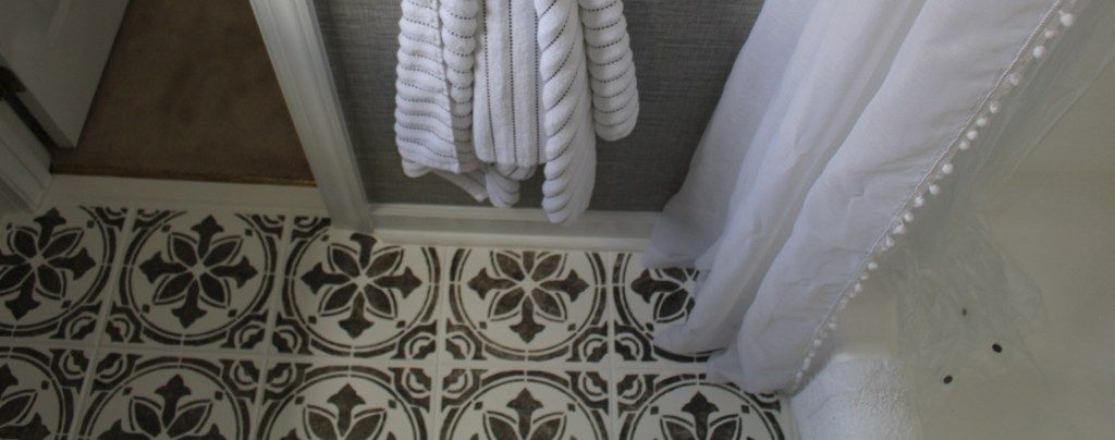 I’m pumped to share some finished photos of this space with you! In case you’re just joining now, you can read how I painted the tile here, and how I stenciled the tile here. You can also check out another bathroom renovation I previously completed in this house.