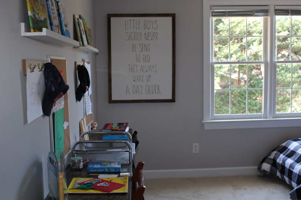 Continuing on from the last post on the boys’ room, I want to share a quick little post about the desks I created for them. I wanted a space in their room to draw and write, but didn’t want to buy more furniture. I wasn’t sure how much they’d actually use them or what their room would be like in a few years. I wanted something more temporary, but still usable.
