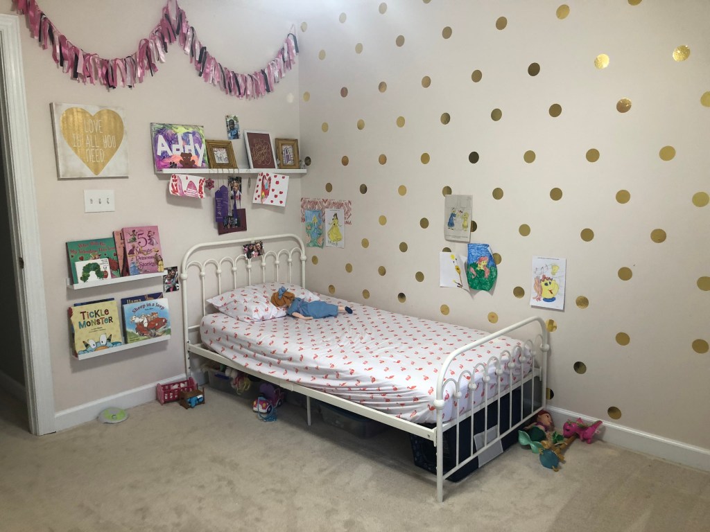 I painted it a blush pink when we moved in and added gold polka dots to one of the walls. We also changed up the configuration of the room so that the bed could be up against a wall (less chances for falling out!). I’ve hung a few other decorations but have been waiting to be “inspired” with what to do next. Here’s how it looks today.