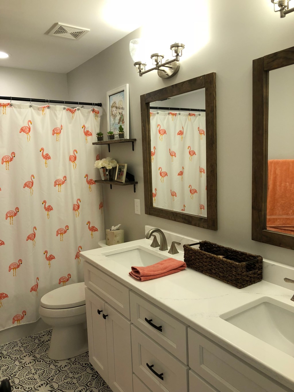 This friend had her entire bathroom redone and needed some help with mirrors and shelves. So I came to the rescue. π Β With the white marble and awesome floors, these wood tones were a perfect fit!