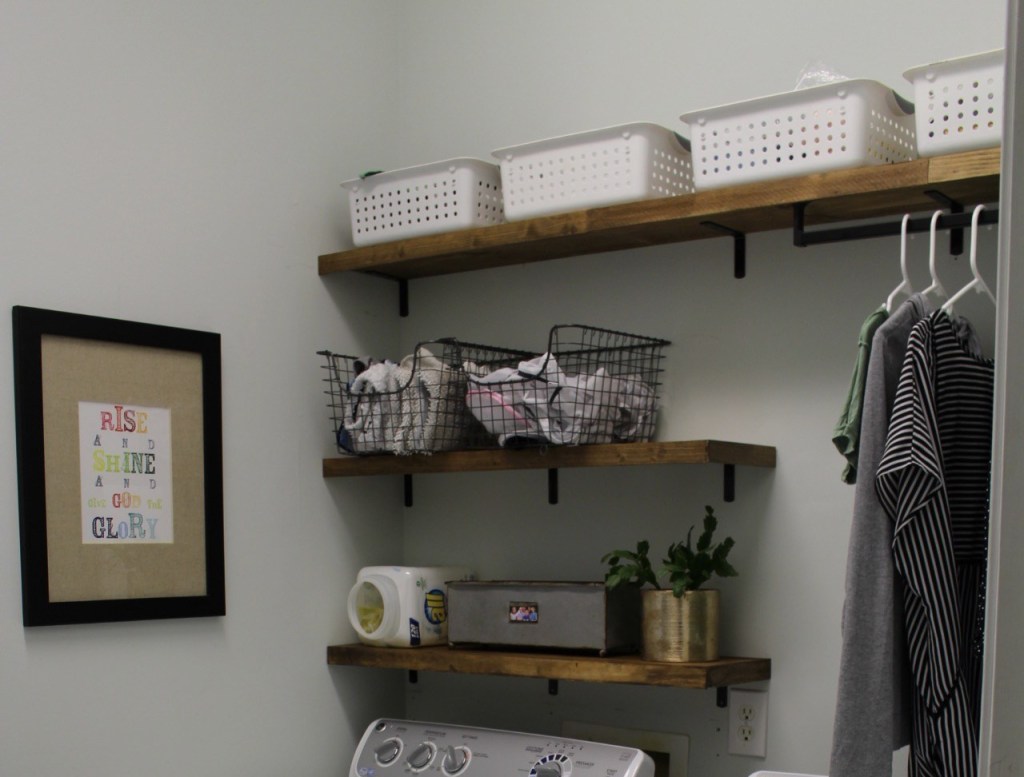 This friend’s laundry room was functional, but she wanted it to be a little bit more aesthetically pleasing :). She took down the cabinets and I built and installed these shelves. They needed a place to continue to hang dry clothes, so we added a clothing bar. We also added a few shelves for extra storage over the sink area. Everything feels so clean and open now. My friend is still looking for coordinating baskets/bins, but I think it’s looking great! Here’s a post with lots of details.